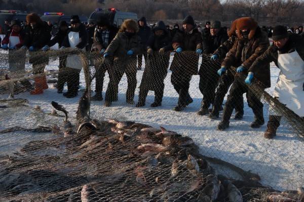 清晨的二龙湖冰面寒气袭人,却挡不住游客的热情。随着渔工们雄浑高亢的号子声响起,千米巨网在拖拉机绞盘的牵引下缓缓破冰而出,万尾鲜鱼在冰面上欢腾跳跃,上演 “冰上劲舞”的丰收盛景,引得现场游客阵阵喝彩。作为宾县“蓝色粮仓”的核心产品,二龙湖鲢鱼凭借肉质鲜嫩、营养丰富的特质,于2019年获评全国农产品地理标志。